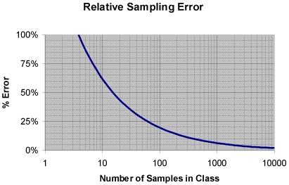 The following equation provides a simple estimate of the percentage error:Plotting this equation as a chart shows how sampling accuracy improves as c increases.